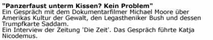 "Yastık altında bazuka mı? No Problem!" Almanya'da yayınlanan "Die Zeit" gazetesi, Amerikalı belgesel film rejisörü Michael Moore ile bir Röportaj yaptı. Moore, son çektiği filmi, legastenik Bush ve onun kozu Saddam üzerine hayli ilginç şeyler söylüyor. Katja Nicodemus'un yaptığı söyleşinin Türkçe çevirisini okuyucularımızın ilgisine sunuyoruz.