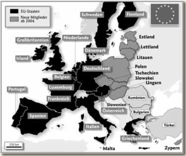 Die EU wurde mit dem 1992 in Maastricht durch die zwölf Staaten der Europäischen Gemeinschaften unterzeichneten und 1993 in Kraft getretenen Vertrag über die Europäische Union gegründet. Seit der letzten Erweiterung 1995 (Finnland, Schweden, Österreich) zählt sie 15 Mitgliedstaaten mit rund 375 Millionen Einwohnern und einer Gesamtfläche von 3,2 Millionen Quadratkilometern. In zwölf von ihnen außer in Schweden, Dänemark und Großbritannien ist der Euro gemeinsames Zahlungsmittel. Am 1. Mai 2004 sollen der EU weitere zehn Staaten beitreten, womit die Bevölkerung auf rund 450 Millionen Menschen wächst. Eine nächste Erweiterungsrunde wird 2007 mit Rumänien und Bulgarien angestrebt. Die Beitrittsreife der Türkei will die EU Ende 2004 erneut prüfen. Ist sie gegeben, sollen Verhandlungen über eine Aufnahme beginnen.