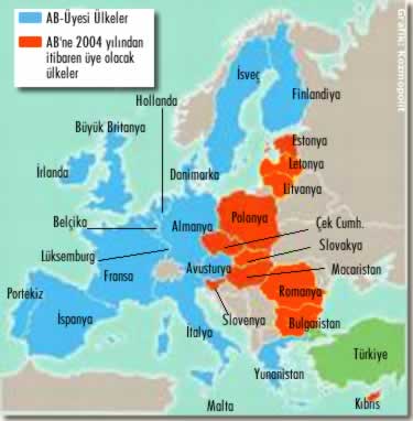 Avrupa Birliği, Avrupa Topluluğu üyesi 12 ülkenin 1992 yılında Maastricht’te imzalanarak yürürlüğe giren AB Antlaşması sonucunda kuruldu. 1995 yılındaki son genişlemesinden (Finlandiya, İsveç, Avusturya) bu yana toplam 15 üye ülkeye ve 3,2 milyon kilometrekarelik bir alan üzerinde 374 milyonluk bir nüfusa sahip. İsveç, Danimarka ve Büyük Britanya haricindeki 12 ülkede Euro ortak para birimi. 1 Mayıs 2004 tarihinde Avrupa Birliği’ne üye olacak on ülkeyle birlikte toplam nüfus 450 milyona çıkacak. Bir sonraki genişleme aşaması 2007 yılında Romanya ve Bulgaristan ile olması bekleniyor. AB 2004 yılı sonunda Türkiye’nin adaylık konumunu yeniden gözden geçirecek. Türkiye’nin koşulları yerine getirmesi durumunda, adaylığı için görüşmeler başlayacak.